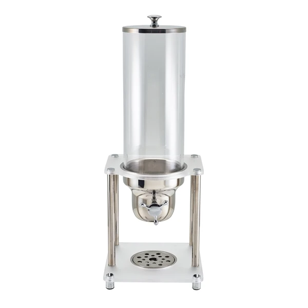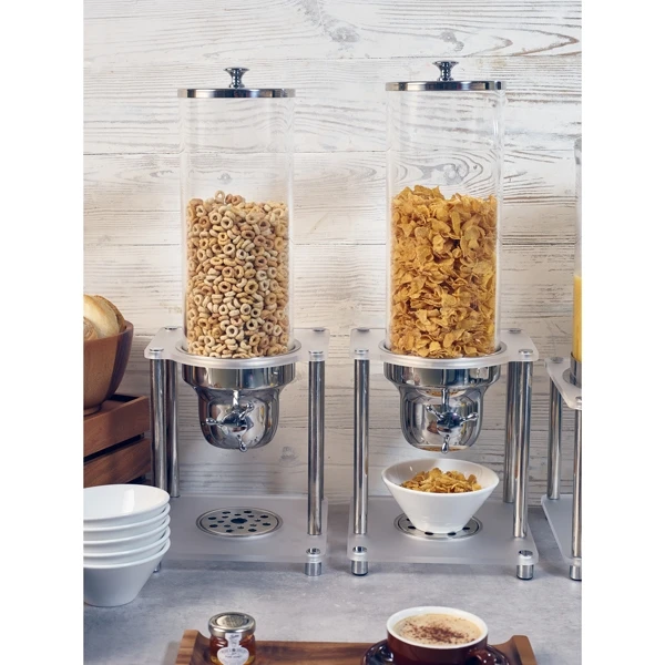 The attractive frosted acrylic base and stainless steel fittings of the cereal dispenser are robust to withstand heavy guest use. The tough clear polycarbonate body can be removed for easy cleaning. Please note that the dispenser is recommended for hand-wash only, while the frame and base may be wiped clean.