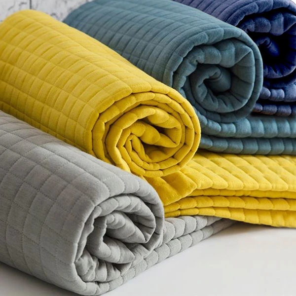 The 60% cotton 40% polyester jersey knitted fabric is quilted on the front side in one inch squares and has a plain jersey knit on the reverse.