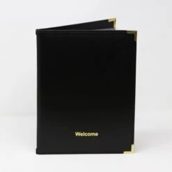 The cover is wrapped in a rich black textured synthetic material that is intended to look like leather, but has the benefit of being easy to wipe and won’t easily attract dirt or fingerprints. Eye-catching gold foil lettering adds a touch of luxury to this simple guest information folder.