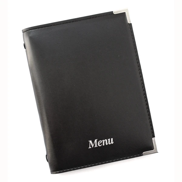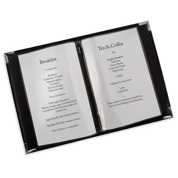 This unique A5 menu display holder features ‘Menu’ printed in silver text on the front. It also has silver gilt corners to protect the holder from daily wear and tear, and the front and back of the holder is reinforced with paneling, making it ideal for daily use. The cover of the holder is of faux black leather which simply wipes clean for effective sanitisation.