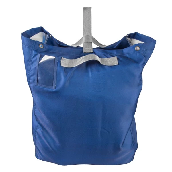 The bag features a protective top flap at the opening and a looped handle enclosure that secures the contents when the bag is full. There is a clear pocket on the side of the bag that may be labeled to identify the contents and/or your establishment which helps to save time at the laundry.