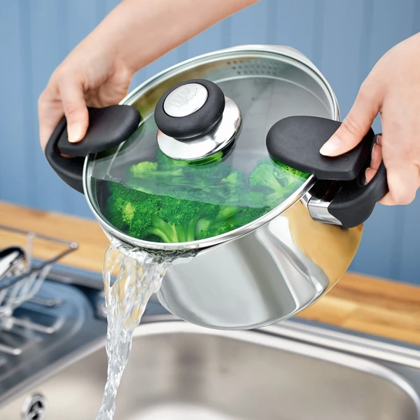 Easy-to-hold, ergonomic handles on either side ensure you can hold this pot safely and securely. Designed to retain and emit less heat, the useful thumb grips facilitate double-handed draining too.