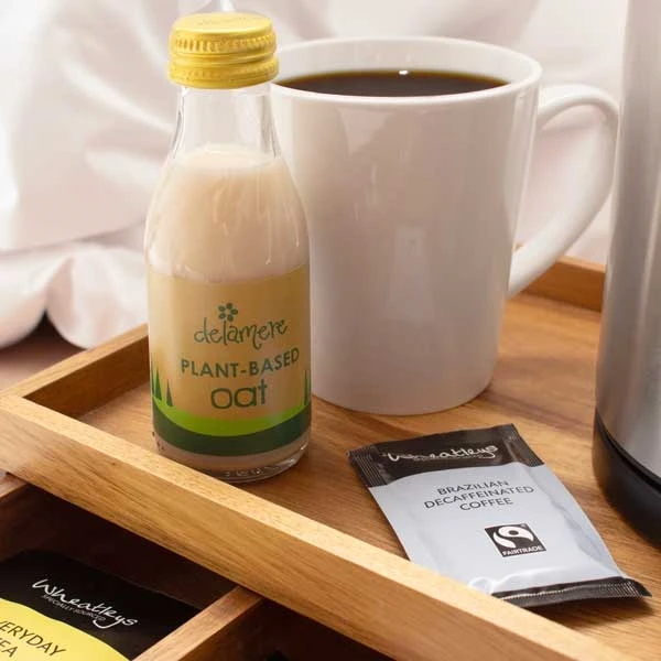 Ensure guests who follow plant-based diets can enjoy a refreshing drink on arrival with these miniature glass bottles of oat drink. Delicious in hot drinks and on cereal, these retro-style glass bottles are a great alternative to plastic pots or sticks that are also easy to recycle too.