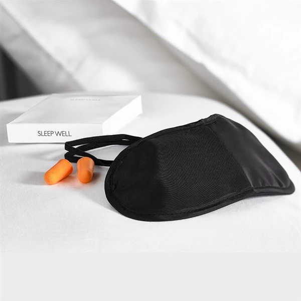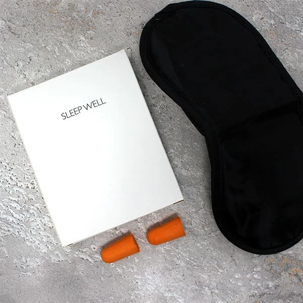 - Each kit contains a black eye mask and a pair of orange foam ear plugs