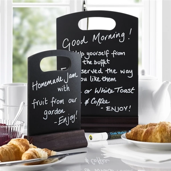 - Substantial wooden tabletop sign featuring 5mm blackboard, built-in handle and heavy wood turned base