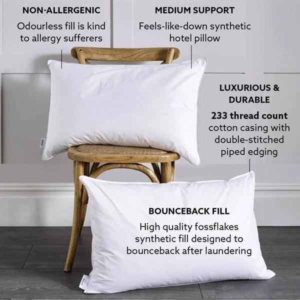 - Extremely long lasting, easy care synthetic hotel pillow with the cosy feel of down